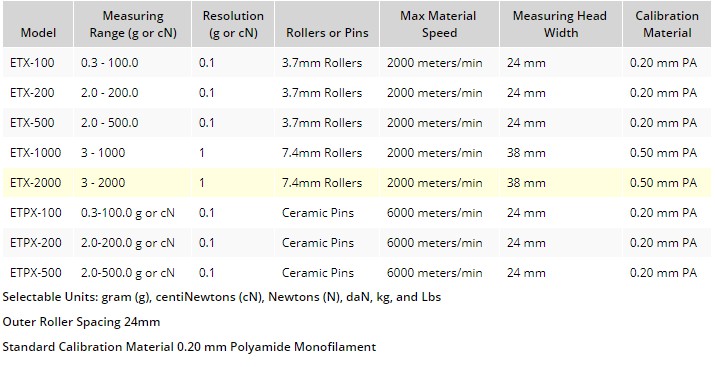 Checkline ETX / ETPX數(shù)據(jù)記錄張力儀專為在各種應用中精確測量細金屬絲,紗線和纖維上的張力而設計。滾子或陶瓷銷釘安裝在長的“指狀物”的末端,使用戶可以在有限的進入空間內或在幾條線緊緊排列時(例如在經紗板上)測量張力。提供五(5)個測量范圍,最大容量為2000克或cN。1000 g和2000 g型號分別在短銷(手指)上安裝了直徑7.4mm的V型槽滾輪,而不是標準長度的銷(手指)和3.7 mm微型滾輪。8KY廣州南創(chuàng)電子科技有限公司