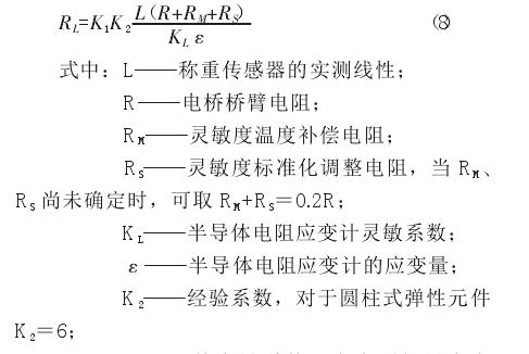 由于彈性元件機械加工、熱處理和粘貼電阻應(yīng)變計等因素影響,稱重傳感器的固有非線性誤差分散較大,不能通過 3 只 ~5 只稱重傳感器進(jìn)行線性補償試驗,求得線性補償電阻 RL的平均值用于批量生產(chǎn)的線性補償中,必須逐個稱重傳感器進(jìn)行線性補償。一般線性補償方法為通過經(jīng)驗公式計算出線性補償電阻值,將其增大 10%~15%就是線性補償半導(dǎo)體應(yīng)變計的過補償電阻值。進(jìn)行線性補償時,只需在線性過補償電阻上并聯(lián)一個金屬膜線性補償精調(diào)電阻,即可精確調(diào)整稱重傳感器的線性補償特性,達(dá)到線性補償?shù)哪康摹Qa償特性與許多因素有關(guān),半導(dǎo)體電阻應(yīng)變計線性補償電阻 RL計算公式如下: