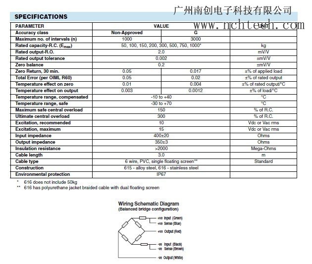 616-1000kg傳感器最終中央過載  % of R.C.  300hzU廣州南創(chuàng)電子科技有限公司