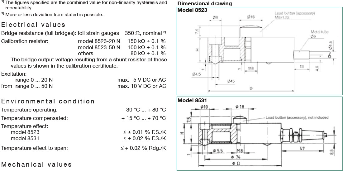 將被測(cè)量的負(fù)載是使用或者施加按鈕或特定的應(yīng)用程序線程部分的負(fù)載8523-100傳感器通過(guò)M8螺紋,它位于緊張的軸和壓縮傳感器。應(yīng)變計(jì)全橋是在傳感器元件,其將所施加的壓力成電信號(hào)。8523-100稱(chēng)重傳感器的安裝是沒(méi)有問(wèn)題的,由于三點(diǎn)支撐。這降低了安裝面要求。為了獲得最佳的測(cè)量結(jié)果,該力以進(jìn)行測(cè)量,必須沿軸向施加到傳感器。橫向力,可避免構(gòu)造措施像安裝在可移動(dòng)的軸承載荷傳感器,指導(dǎo)袖子等載入按鈕(見(jiàn)圖紙)啟用的最佳器具的壓縮力的負(fù)荷傳感器。測(cè)量在非軸向載荷應(yīng)用程序錯(cuò)誤是可以忽略不計(jì)達(dá)由于傳感器的凸面3 °的角度誤差。的輸出信號(hào)為正時(shí)中的校正方向運(yùn)動(dòng)(壓力) 。在特征值張力的方向可以從校準(zhǔn)方向偏離的壓縮高達(dá)0.3%。i6b廣州南創(chuàng)電子科技有限公司