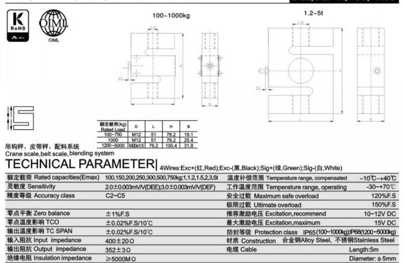 靈敏度:2.0 ± 0.02 mV / V的( 20KG - 7.5T )1.8 ±0.02 mV / V的(10T )EXM廣州南創(chuàng)電子科技有限公司