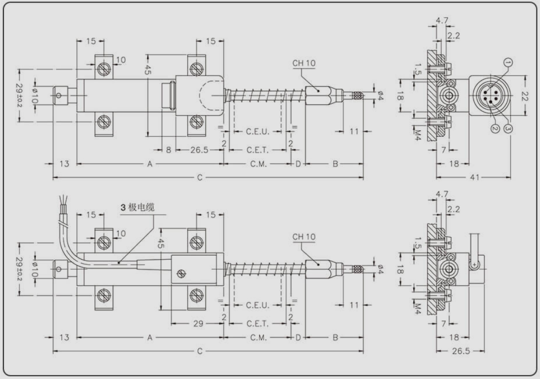 PY1、PY2、PY3自復位直線位移傳感器(別名:電子尺,電阻尺,電位器,位移傳感器)原理:電位計原理,傳感器采用側(cè)面雙向控制通桿結(jié)構(gòu),整體強度更高。測桿通過復位彈簧自動復位,適用于各種對比測量。輸出直流電壓信號,也可以通過內(nèi)置或者外置的變送模塊講信號轉(zhuǎn)換成標準的0-5V、0-10V或者4-20mA直流信號,也可以遠距離傳輸控制要求。5I5廣州南創(chuàng)電子科技有限公司