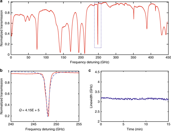 我們首先使用應(yīng)用程序顯現(xiàn)了封裝的WGM傳感器的光譜特性,傳輸頻譜如圖2a所示,頻率跨度為450 GHz,從而可以觀察到具有不同共振頻率、品質(zhì)因數(shù)和極化的多個共振模式。具有更高品質(zhì)因數(shù)的諧振模式將有助于解決更小的頻率漂移,從而提高傳感性能。圖2b給出了高質(zhì)量模式和洛倫茲擬合的透射光譜,品質(zhì)因數(shù)為~4.2×1。為了驗(yàn)證整個系統(tǒng)的穩(wěn)定性,記錄共振模式線寬的時(shí)間軌跡為15分鐘,觀察到3.15GHz的平均線寬,標(biāo)準(zhǔn)偏差為0.03GHz(圖2c)。4KE廣州南創(chuàng)電子科技有限公司