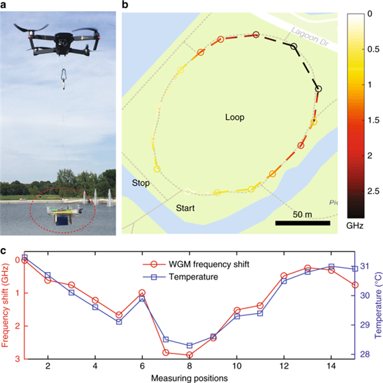 當(dāng)無人機(jī)從一個測量位置飛到另一個測量位置時(shí),WGM傳感器的共振頻率由于溫度變化而發(fā)生變化,共振頻率的變化如圖4b所示 ,其中可以清楚地看到溫度變化的梯度,測量結(jié)果與商用溫度計(jì)的結(jié)果匹配良好(圖 4c)。在補(bǔ)充材料中我們提供了視頻演示,其中攜帶整個系統(tǒng)的無人機(jī)從具有較高溫度(在陽光下)的一個位置飛行到具有較低溫度(在陰影中)的另一個位置,使用定制的移動應(yīng)用程序可以清楚地觀察到共振頻率的偏移。4KE廣州南創(chuàng)電子科技有限公司