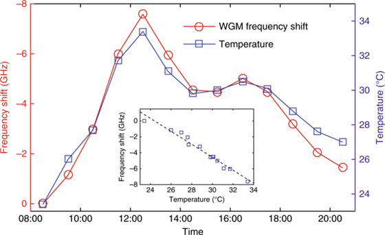 通過12小時(shí)的測量,我們獲得了所選諧振模式的頻移圖(如圖3所示) ,封裝WGM傳感器的共振頻率偏移與商用溫度計(jì)的結(jié)果匹配良好,并且與溫度變化具有線性關(guān)系(圖 3插圖)。兩條曲線的小偏差主要來自激光頻率的不穩(wěn)定性,通過優(yōu)化激光電流驅(qū)動器和TEC控制器的電路設(shè)計(jì)可以將偏差最小化。4KE廣州南創(chuàng)電子科技有限公司