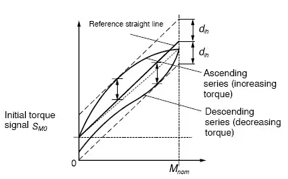 包括滯后在內(nèi)的線性誤差也可以理解為公差帶寬度的一半,該寬度與參考直線對稱(見圖5)。與線性誤差測定程序的唯一不同之處在于,這里包括減小扭矩的測試過程。此差異對參考直線計算和參考直線誤差都會產(chǎn)生影響。y29廣州南創(chuàng)電子科技有限公司