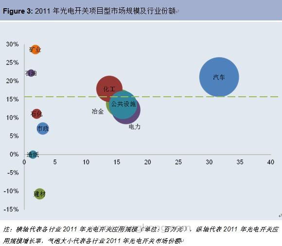 2011年,項(xiàng)目市場(chǎng)光電開(kāi)關(guān)銷(xiāo)售額為1.46億元,同比增長(zhǎng)15.8%,低于2010年16.7%的市場(chǎng)增速。該市場(chǎng)銷(xiāo)量最大的行業(yè)是汽車(chē),銷(xiāo)售業(yè)績(jī)?yōu)?160萬(wàn)元,占項(xiàng)目型市場(chǎng)的21.7%。電力行業(yè)作為第二大應(yīng)用行業(yè),2011年對(duì)光電開(kāi)關(guān)的需求由2010年的下滑3.4%轉(zhuǎn)為同比增長(zhǎng)12%,業(yè)績(jī)達(dá)到1650萬(wàn)元。nr2廣州南創(chuàng)電子科技有限公司
