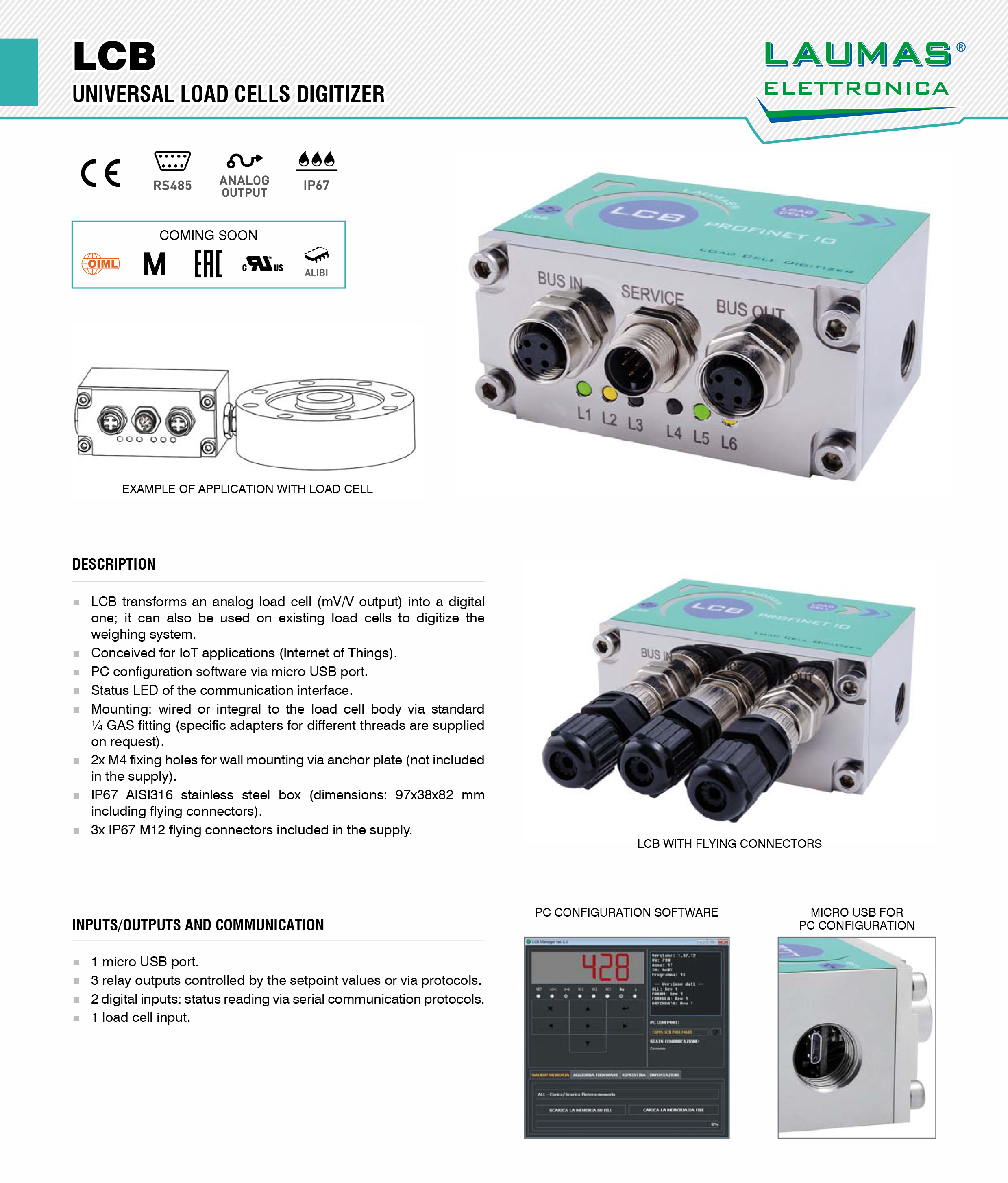 LCB重量變送器用于稱重傳感器的數(shù)字化儀/重量變送器,著眼于物聯(lián)網(wǎng)(物聯(lián)網(wǎng))(物聯(lián)網(wǎng))。IP67接線盒由AISI 316不銹鋼制成,適用于惡劣環(huán)境。三個IP67 M12連接器。通訊接口的六個指示燈。尺寸:97 x 38 x 82毫米(包括連接器)。gYO廣州南創(chuàng)電子科技有限公司