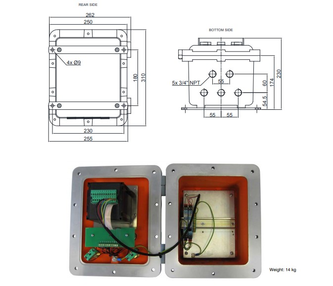 防爆箱,已通過(guò)ATEX II 2(1)GD認(rèn)證,配有耐熱透明鋼化玻璃窗和5個(gè)外部按鈕,其功能與W200鍵盤(pán)相同